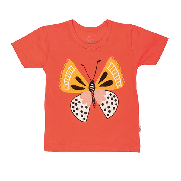 Collectie Zomer 2021 T-Shirt cayenne met vlinder opdruk kwaliteit 100 % biokatoen , mooie slimfit pasvorm.